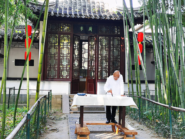 竹林掩映的兰亭门前,一位长者书法家在门前的长桌上书写诗句;瘗鹤铭庭院前,一对华侨夫妇带着两名孩子向拓碑手艺人…...