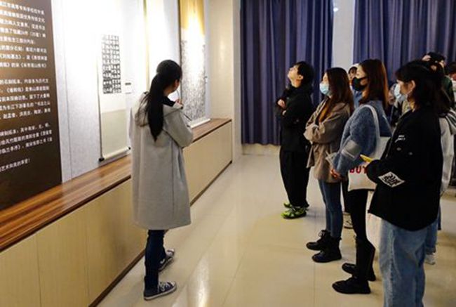 为加强校园美育氛围,丰富学生文化生活,增进我馆与校外美育实践基地的合作,2020年10月26日,“鹤鸣九皋——镇江焦山碑林馆藏名碑名帖拓片展”在镇江市高等专科学校崇爱楼二楼展厅开展。展览首日,校党委书记林枫,校长丁钢,副书记王桂龙,美育办公室全体成员及部分在校学生参观了展览。我馆工作人员在现场对每幅展品作了详尽介绍,观展师生置身其间,阅见碑刻的前世今生。