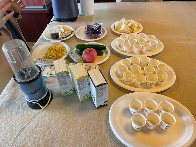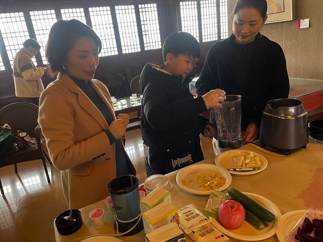 来自镇江市中山路小学的二(6)班的张辰露小朋友现场为大家挥笔书写了“金”、“木”、“水”、“火”、“土”几个大字。每写一个字,大家就将对应颜色的食材制作出营养早餐。现场气氛热烈,活动受到了大家的一致好评。