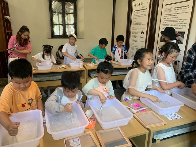 在社教员的带领下,孩子们先后参观学习了碑林的重要碑刻,了解了宣纸在传印碑刻文字时的重要作用,并对古人的造纸技术产生了浓厚的兴趣。 随后在焦山碑林的互动体验室内,孩子们运用刚刚所学的知识,动手实践,创造出了一幅幅精美而有特色的古法造纸手工制品。他们相互展示并分享着喜悦。 一团纸浆被千百次的搅匀,然后得以塑性成纸张。这过程既是孩子们锻炼动手能力的过程,也是社会教育的意旨所在。镇江焦山碑刻博物馆通过这样的活动,引导孩子们学习传统文化,热爱文化场馆,过上一个更有意义的儿童节。