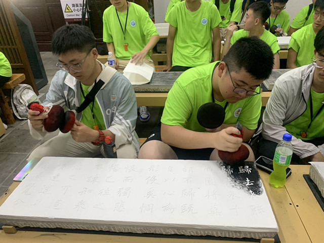 在碑林的互动体验室内,通过老师的解说与示范,同学们开始动手体验传统拓片的制作过程。同学们初步掌握了拓片技艺。