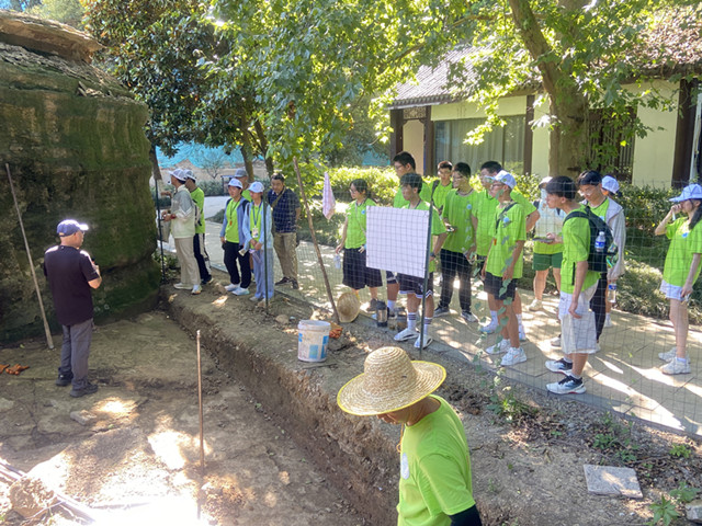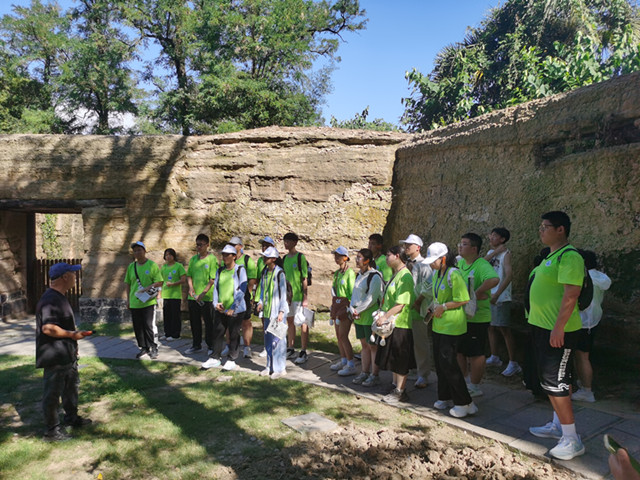 在焦山古炮台考古工地,同学们在考古老师的介绍下,了解考古对于传承与弘扬优秀传统文化的重要意义。