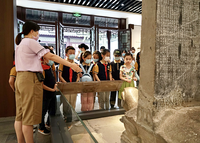 “大手拉小手,碑林走一走”——镇江市实验小学二(2)班假日活动小记 焦山碑林是国家历史文化名城镇江的一颗璀璨明珠,自北宋开始藏碑,现为全国重点文物保护单位。它的规模虽然不大,但特色鲜明,拥有以“大字之祖”——六朝《瘗鹤铭》为代表的摩崖石刻80多方、碑刻400余方,素有“江南第一碑林”之美誉。 为了丰富未成年人暑期生活,我馆开展了“七彩夏日——弘扬传统文化 走进焦山碑林”系列活动,7月20日下午,我馆迎来了镇江市实验小学二(2)班2020年暑期假日小分队全体队员。大家跟随着讲解员的脚步,认真聆听这些石头背后的故事,从“初唐妙品”魏法师碑到澄鉴堂石刻、从乾隆下江南留下的“乾隆御碑”到被称之为“大字之祖”的镇馆之宝瘗鹤铭……每一块碑石的来历和意义都令人震撼,深深的触动了这些孩子和家长们的内心。最后,大家纷纷表示,非常荣幸能参与这次的活动,受益匪浅,也为我们祖国博大精深的历史而感到骄傲和自豪。