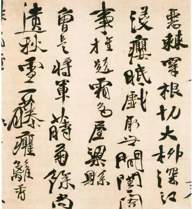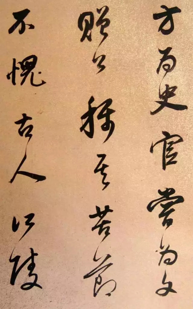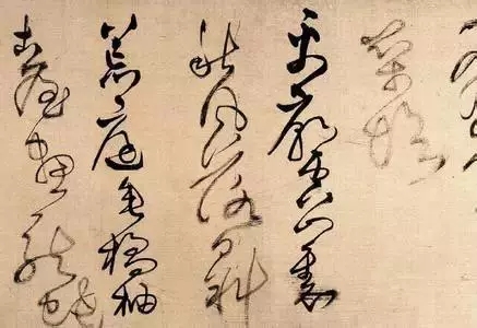 草书发展到唐代,在东晋“今草”基础上又有飞跃发展。草书的字形进一步被打开,草书中汉字的实用信息传递功能进一步被消减,书法的抒情性得到进一步加强。一种与音乐相类似的通过汉字书写表现情感的纯艺术——“狂草”由此诞生。推动草书艺术走峰巅的,正是中国书法史上的奇人——大书法家张旭。唐代大文豪韩愈曾描述曰:“往日张旭善草书,不治他技。喜怒窘穷,忧悲、愉夫、怨恨、思慕、酣醉、无聊、不平,有动于心,必于草书焉发之。观于物,见山水崖谷,鸟兽虫鱼,草木之花实,日月列星,风雨水火,雷霆霹雳,歌舞战斗,天地事物之变,可喜可愕,一寓于书。故旭之书,变动犹鬼神,不可端倪。以此终其身而名后世。”唐人好以书饰壁,相传张旭经常是狂饮大醉,然后举笔“呼叫狂走,乃下笔”。甚至疯狂地“以头濡墨而书”,“既醒自视以为神,不可复得也”。因此他在历史上得了一个外号“张颠”。张旭的草书纵横奔放,气势凌厉,一如李白的诗,弥漫着一股盛唐时代特有的浪漫气息。这里凝聚着他一生的悲欢,也融铸着他一生的愤懑忧郁。时人以李白之诗、裴旻之剑、长史之草书为盛唐“三绝”。