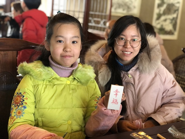 在社教员的带领下,小同学们学习认识了一方精美的碑刻在古人手中是如何被制作出来的,并兴致勃勃地拿起手中的毛笔和刻刀在雕刻橡皮上开始了自己的模仿创作。元旦是人们总结过去,展望新一年的节点,孩子们纷纷用最喜庆的颜色写下自己新的一年最美好的愿望,并在家长的协作下用刻刀细细的剃出来,形成一方方精美的刻章。“我希望新的一年可以考满分!”,“我希望新的一年可以变得更自信!”孩子们举着自己刚刚完成的作品,相互交流展示着,稚嫩的笑脸上洋溢着想在新的一年大展拳脚的干劲与期待。