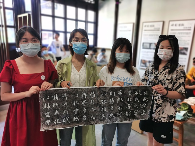 在碑林老师的带领下,同学们依次参观了《“深刻的记忆”镇江市东亚文化碑拓展》和焦山碑林,通过拓片与碑刻感受日本遣唐留学生阿倍仲麻吕夜泊瓜州时的望月思乡、随大韩民国临时政府流亡至此的朝鲜爱国志士李宁斋的满腔热血,遐想“大字之祖”瘗鹤铭背后书者与仙鹤的传奇故事,品读历代文人游历镇江山水留下的诗词题名,体验碑刻上的千秋石语带来的独特魅力。