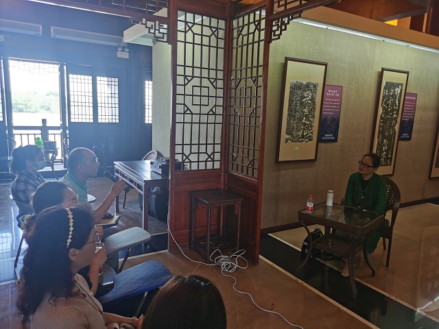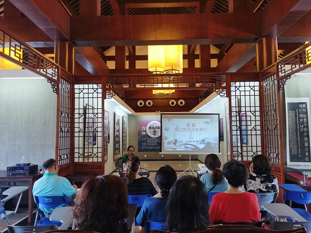 镇江坐京杭大运河与长江交汇之地,居南北文化交流融会之所,有着蓬勃的文化生命力和丰厚的历史人文资源。萧老师从北固楼上“天下第一江山”的题字讲起,依次为人家介绍了王羲之头号粉丝梁武帝萧衍与千字文出世的渊源种种,淡墨探花王文治笔画间的圆转动人、风神萧散,烟云掩映间米芾的米氏山水如何一兴京江画派的先河,曾熙、张大千等古今书法名家学习临写《瘗鹤铭》的风雅趣闻等。 萧老师从不同的角度解读书法名家们与镇江的渊源,通过他们在镇江留下的书法瑰宝,让听众们真切地感受到书法文化与自己的生活如此之近、如此之亲。讲座结束后,主讲老师还与观众们就讲座内容进行了心得交流,并认真回答了观众提出的问题。