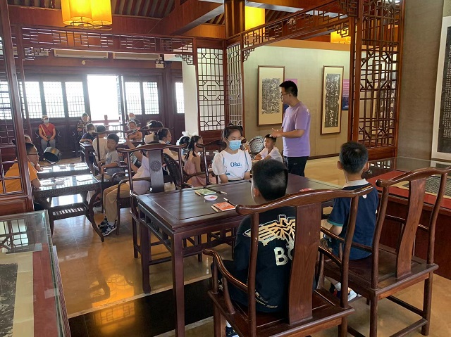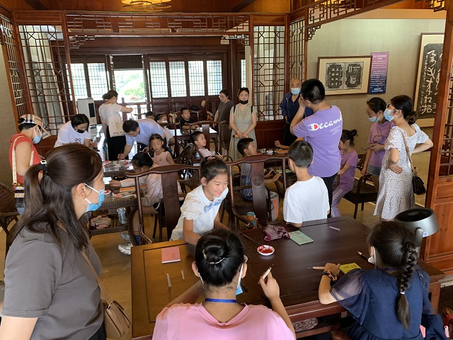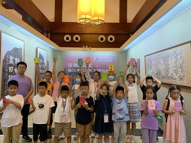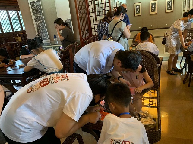 7月21日上午,镇江焦山碑刻博物馆开展了“石上书丹”橡皮章篆刻体验活动。十五组镇江日报社小记者亲子家庭齐聚焦山书画院,在社教员的带领下学习篆刻知识、了解碑刻文化、体验橡皮章篆刻手工制作。