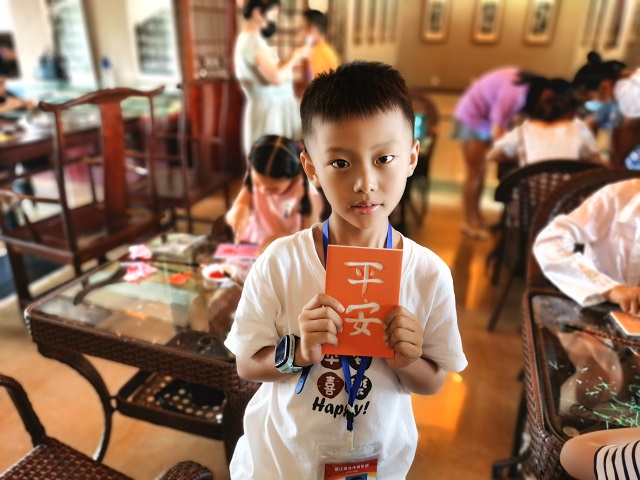 书丹是碑刻制作的重要流程之一,小同学们模仿着古人的做法也用毛笔沾着朱砂在雕刻橡皮上开始了自己的书法创作,写下自己的美好愿望;然后取出刻刀,沿着笔锋前进的轨迹,一刀一凿地将自己的小小心愿篆刻成型;制成一方精巧的橡皮章手工作品。在制作过程中,小同学们与家长通力合作,共同商讨文字内容、研究字体布局、相互协作用刻刀一点点调整笔划的深浅宽窄、顿挫美感,在亲子合作的同时增进了家庭感情。随后,参与活动的各组家庭还相互交流展示了自己的作品并合影留念。