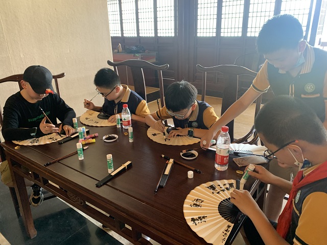 活动中,小同学们先是跟随社教员参观了瘗鹤铭和镇江市东亚文化碑拓展的精美拓片;在老师的讲解下,认真学习了瘗鹤铭等书法作品的书法特色,结字布局、笔画之妙;然后开始动手创作自己的扇面书法作品。有挑战临写瘗鹤铭的,有仿学冈村繁和米芾题字的,还有别出心裁自拟词句的,各个舞文弄墨,好不热闹。最后在老师的指导下,同学们将写好的扇面糊装成型固定在扇骨上,一把把精巧的书法折扇就完成了。