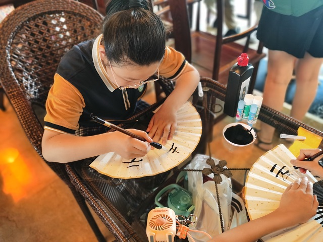 7月25日上午,20多名青少年来到焦山书画院,参加焦山碑刻博物馆举办的“小扇引微凉”书法折扇手工活动,走进中国古代扇文化、学习和了解以瘗鹤铭为代表的焦山碑刻书法艺术并动手实践制作自己的折扇作品。 扇子在我国有着悠久的历史,从传说中的虞舜制“五明扇”到长沙马王堆汉墓出土的“篾丝长柄扇”,从“羽扇纶巾”的三国风流人物再到“歌尽桃花扇底风”那宋元明清诗词中数不尽的扇元素,扇子在中华文化中一直扮演着重要的角色。而为扇子题写字画则起自三国,盛于明清,与书法相结合的折扇寄寓了文人墨客的文化意趣,开合之间,诗文浮现,水墨流连,更显风流雅致。
