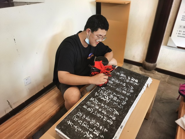 随后,在碑林的互动体验室内,同学们开始动手体验传统拓片的制作过程。通过老师的解说与示范,备纸、上纸、锤拓,一道道工序在同学们的摸索中成功一一复刻出来,一张张乌黑亮丽的拓片也最终成型。
