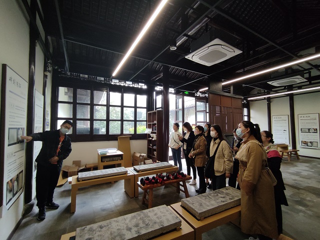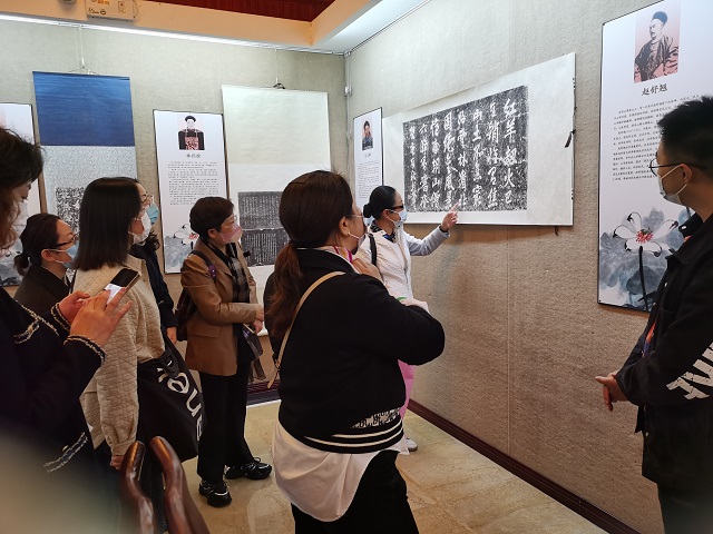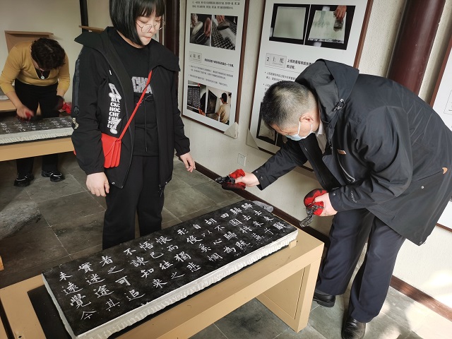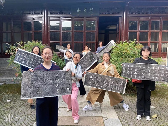 在随后的研学活动中师生们还先后参观了“廉脉传千秋 清风沐京口”践行党的“二十大”精神廉政书画特展、焦山碑林,并在焦博互动体验室感受了一次拓片制作体验。在碑林老师的讲解和传授下,大家手中的纸与墨,经碑石与拓包碰撞磨合诞生出一张张精美的拓片,金石流韵的魅力与传统技艺的精妙令所有参与者们深深沉浸其中。