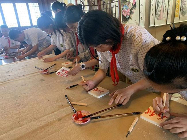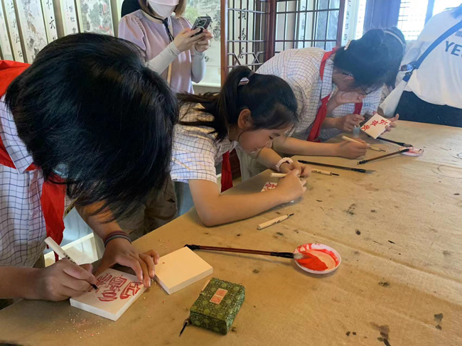 碑刻是刻在石头上的历史,刻碑立石期的是“寄坚贞之石质,永垂昭于后世”,家国大事、经文典要,具有重要的历史文化意义,而在发展中又与传统书法相结合增添了一分艺术魅力。同学们跟随着老师的讲述模仿着古人的做法,用毛笔沾着朱砂在石膏刻板上拟上文字,这是碑刻制作中的重要步骤“书丹”,而后用刻刀顺着笔触细心着磨刻文字,刀痕顿挫、凿划起伏,金石韵味便渐渐展现于刻石之上。