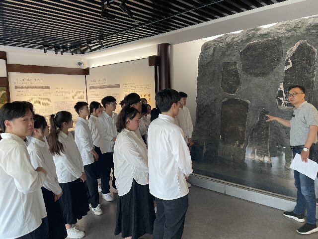另一场“网友品文化旅游”——研学之旅,也在这个缤纷的夏日如火如荼地开展着。来自镇江高专艺术设计学院书法教研室教师带领学生进行《瘗鹤铭》专题的实景教学活动。活动中,课程教师赵群在《瘗鹤铭》主题展厅外与学生轻松互动,让学生讲述了自己课前了解的关于《瘗鹤铭》的相关信息,引起了同学们欣赏、学习《瘗鹤铭》原石刻的兴趣。随后,书法教研室主任马军老师则为同学们从用笔、结体、章法三方面,着重分析了《瘗鹤铭》碑文书法的隽永魅力。马老师还示范临摹碑文,详细讲解了临写要点,并指导学生现场临摹实践。通过此次实景教学,同学们纷纷表示受益良多。学生施景元说:“我们平时都是在家里临帖,今天居然能到现场对着原石进行练习,这种感觉太震撼了!”学生于小雪则表示:“看了《瘗鹤铭》石刻、听了老师们的讲解,我更加惊叹于我国古代工匠和劳动人民的智慧和力量,也更加认识到我们新时代大学生对中华优秀传统文化传承的责无旁贷!”