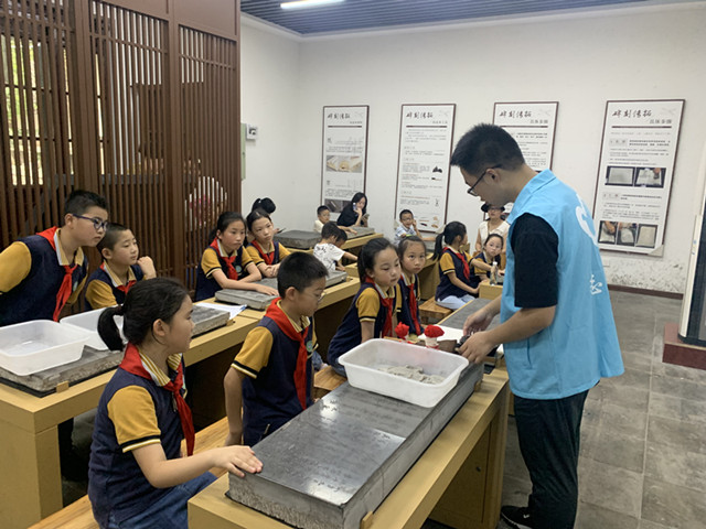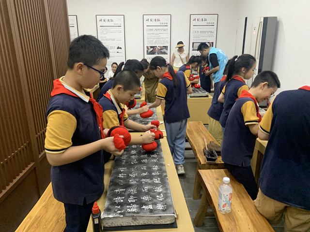 2023年7月26日,镇江焦山碑刻博物馆开展“金石印象”拓片制作文化体验活动,向学生们介绍拓印技术的产生、发展及文化价值等内容,并为学生现场演示拓片的制作工艺和操作技巧。