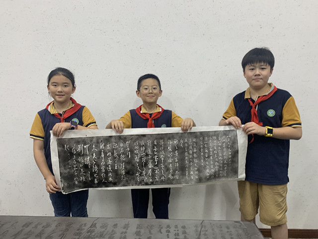 在社教员的指导下,孩子们亲自动手体验拓片的制作过程,完成了备纸、上纸、拓墨等各个步骤,感受中华传统文化的魅力。