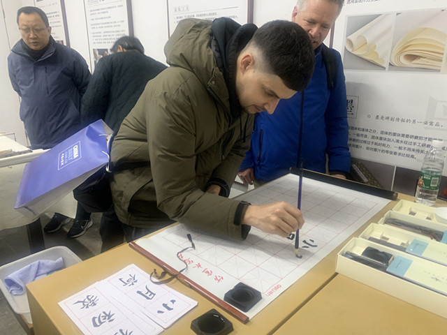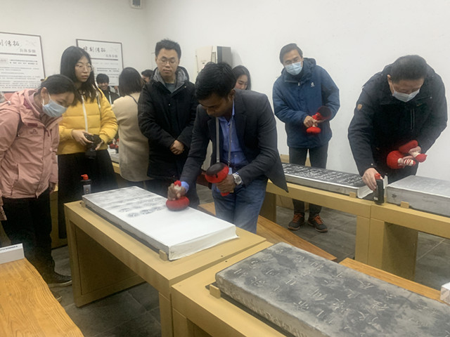 在参观活动中,外宾们借助讲解员的解说观览并欣赏了众多碑林馆藏精美碑刻,通过碑刻的历史背景与艺术价值沉浸式地感受着中国古老而神奇的碑刻文化与金石背后镇江这座古城悠长而绵劲的历史脉搏。很快,这股升腾起的文化兴趣便被外国朋友们运用在了后续环节的书法、碑拓体验之中,他们认真模仿着专业老师示范的手法,摹写汉字、拓印纹理,完成了第一次的书法、拓片创作。他们的作品初看之下或略显生涩,但其中所蕴含的异国风情和独特视角,却为作品增添了别样的魅力。
