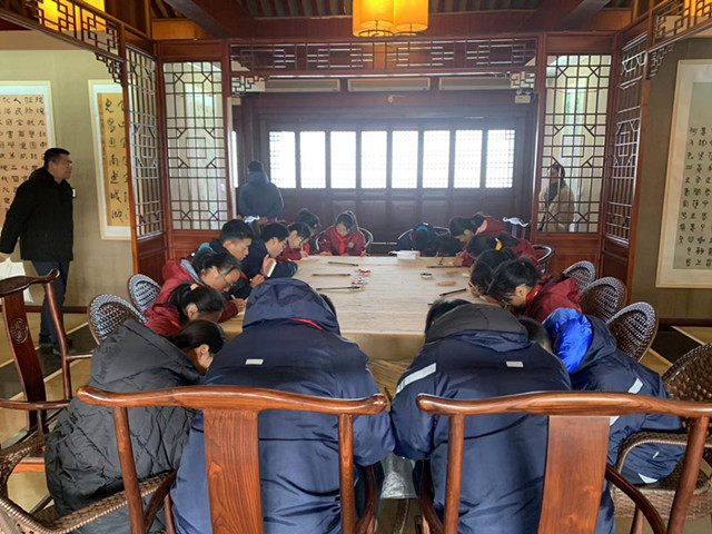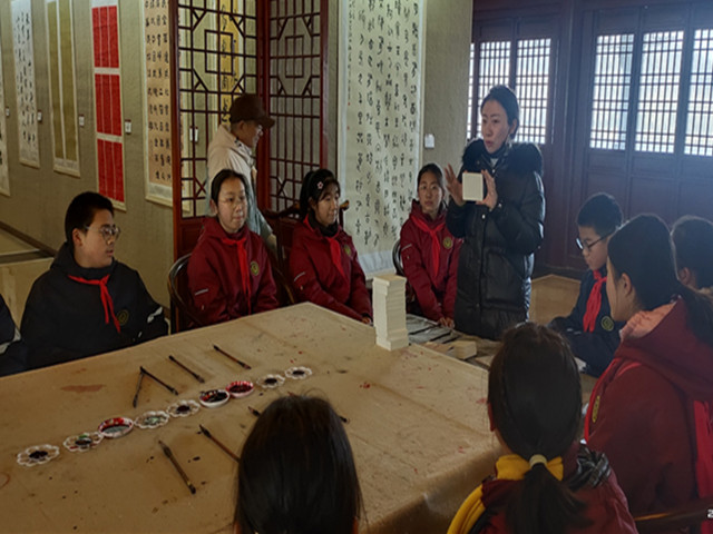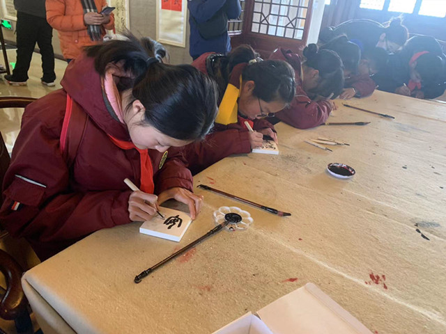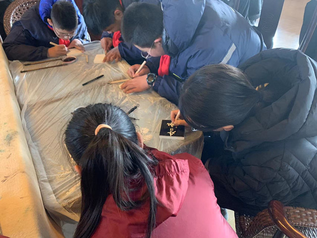 在社教员的带领下,同学们学习认识了一方精美的碑刻在古人手中是如何被制作出来的,并兴致勃勃地拿起手中的毛笔和刻刀在石膏板上开始了自己的模仿创作。元旦是人们总结过去,展望新一年的节点,孩子们纷纷在石膏板上写下自己新的一年最美好的愿望,并用刻刀细细的剃出来,形成一方方精美的作品。