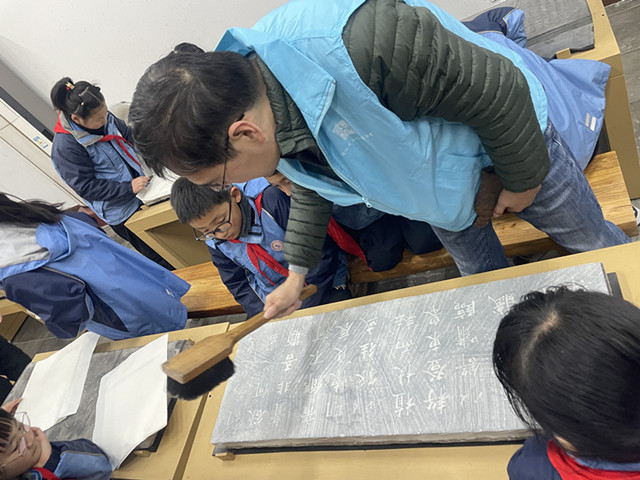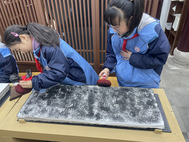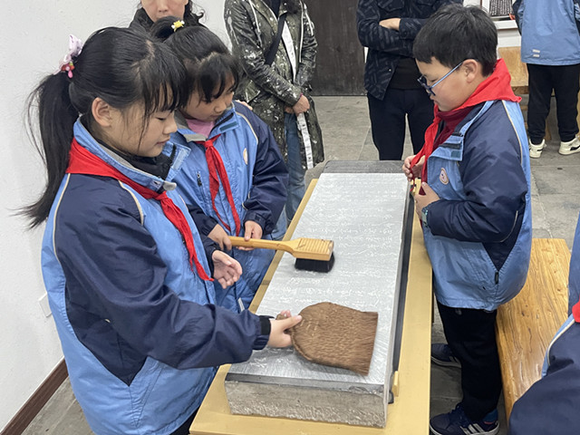 参与活动的桃花坞小学部分学生到访焦山碑林,在社教老师的引领下走进碑刻艺术,感受拓印之美。在拓印体验环节,社教老师用通俗易懂的语言为孩子们讲述了拓印技术的历史发展过程及特点,让大家深刻认识到拓印技术的历史意义与价值。