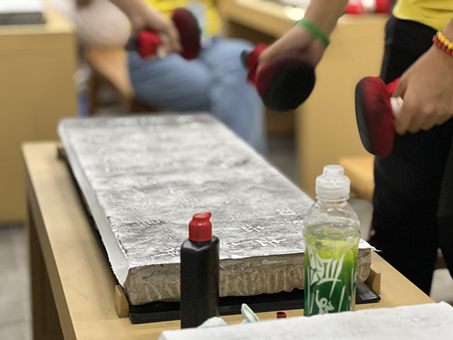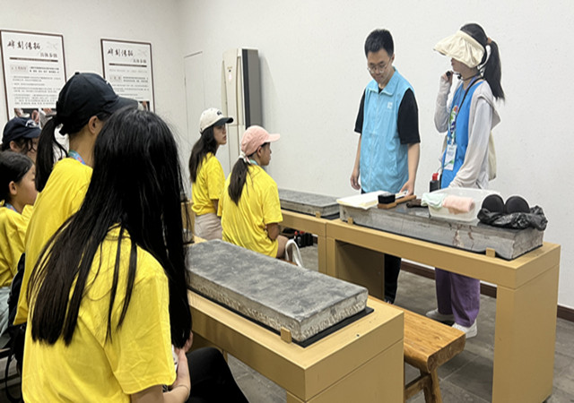 在欣赏完碑刻之后,交流团成员们又亲自动手体验了传统碑刻拓片制作工艺。在博物馆老师的指导下,他们小心翼翼地将湿润的宣纸覆盖在碑刻上,用拓包轻轻敲打,体验中国古代独特的“拷贝”技术。这一过程中,青少年们不仅感受到了中国传统工艺的精湛与细腻,更对中华文化的博大精深有了更直观的感受。